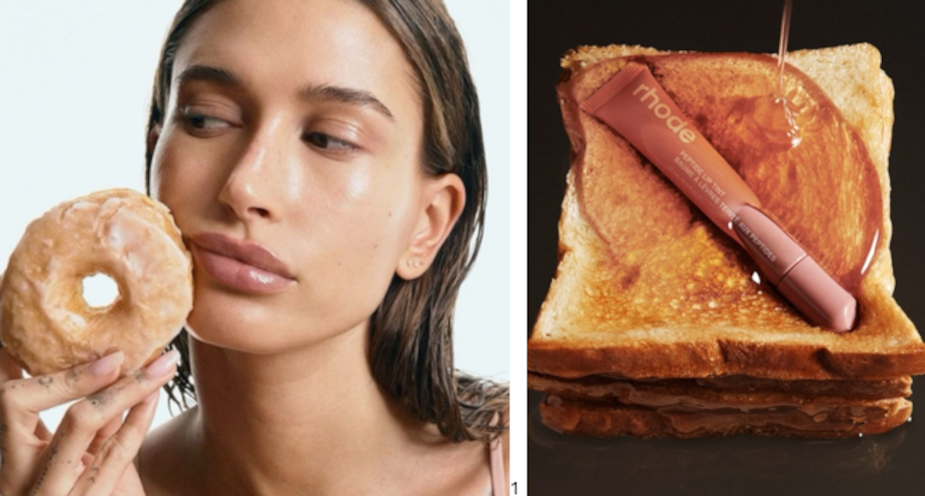 3. Rhode Хейли Бибер закрепил ассоциацию ухода за кожей с «вкусным» удовольствием. Эффект сияющей, будто глазированной кожи поддерживается визуалами с донатами и выпечкой. Такой приём работает на уровне ощущений: забота о себе воспринимается как маленький десерт, а не как рутина.