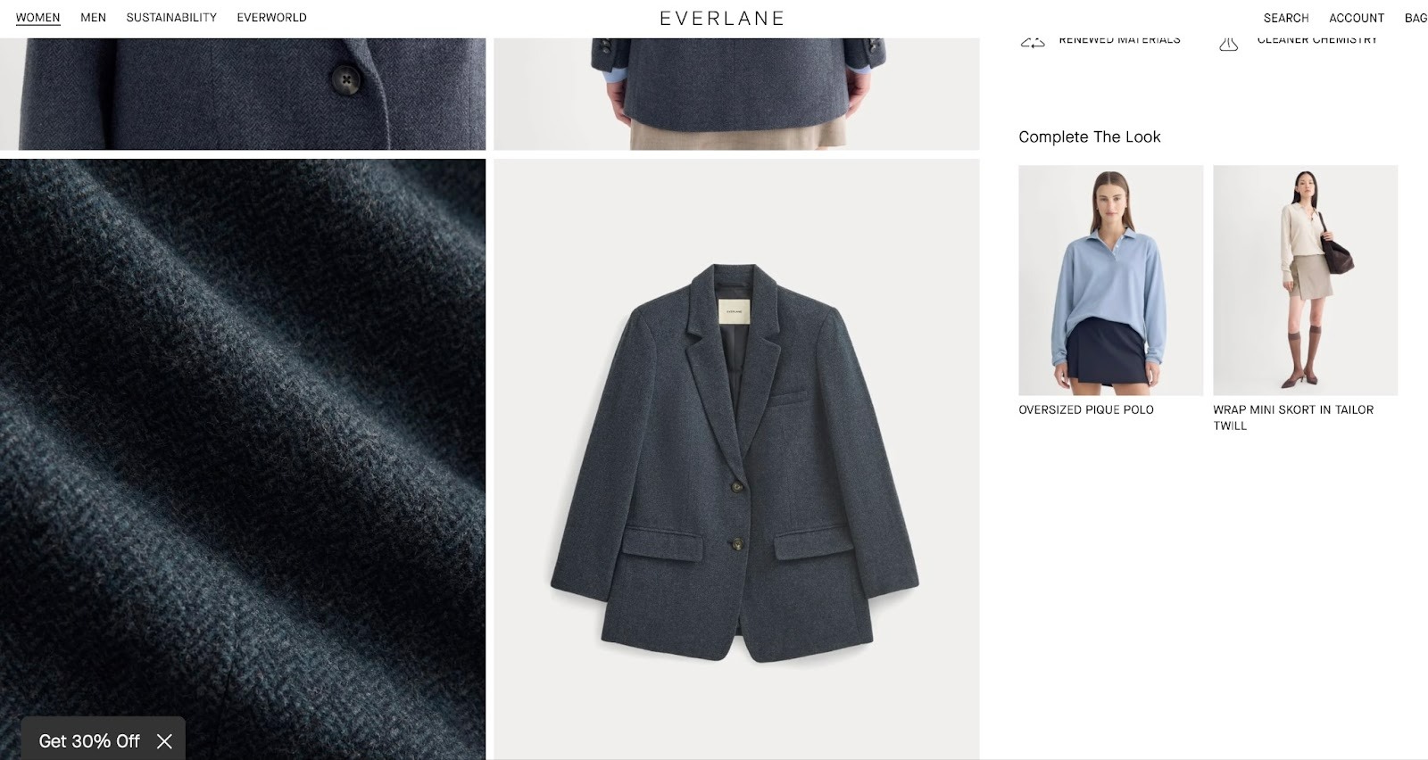 Everlane акцентирует внимание на премиальном материале и переработанных волокнах, демонстрируя текстуру крупным планом. Это позволяет покупателям прочувствовать ткань глазами и понять, чего ожидать при доставке.