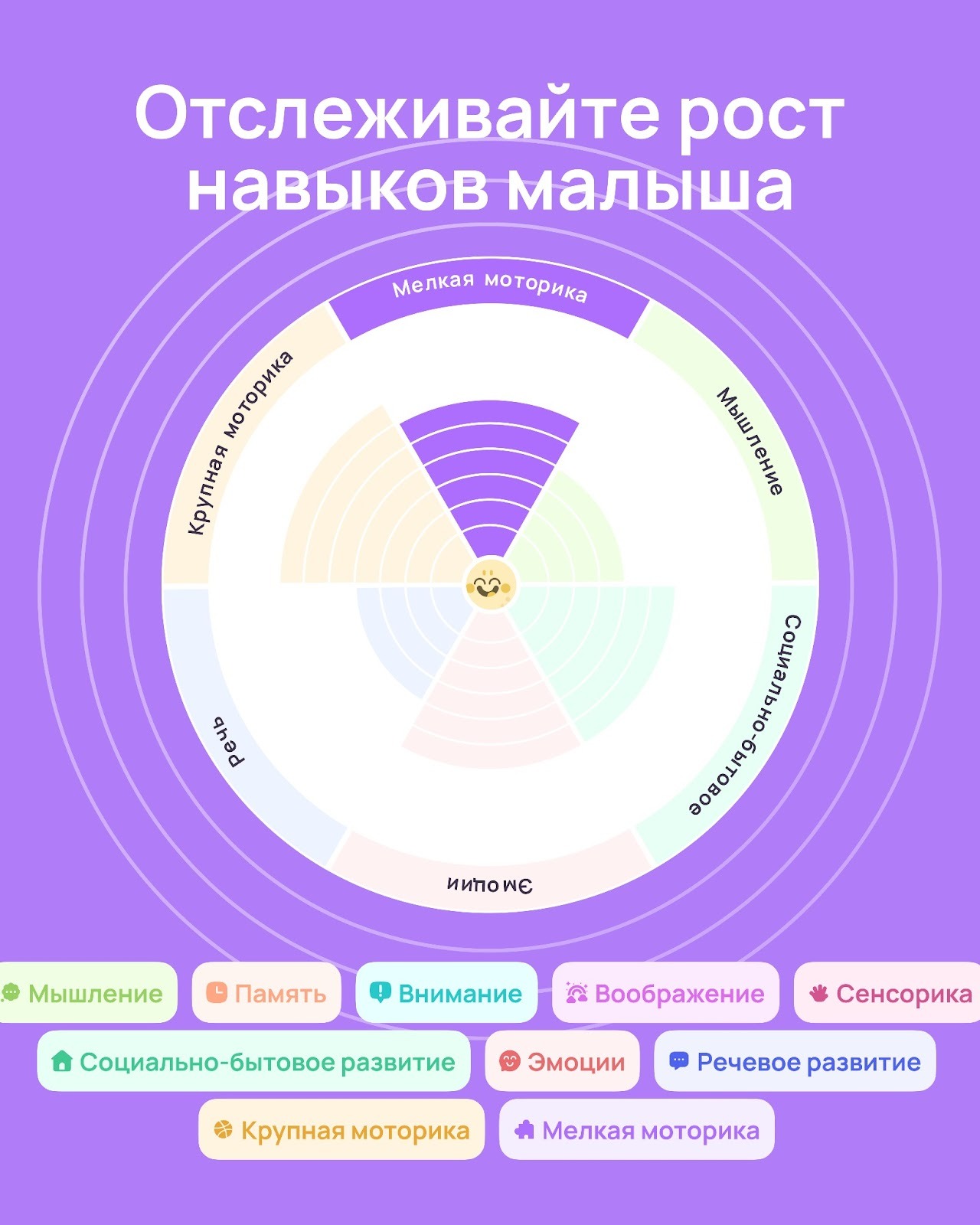 Карта развития. Цели, которые ставит перед вами приложение: что желательно развивать в ребенке и на какие детали нужно обратить внимание, что уже умеет ваш малыш (на основе предыдущего тестирования). Также, советы, какие занятия проводить на развитие этих навыков;