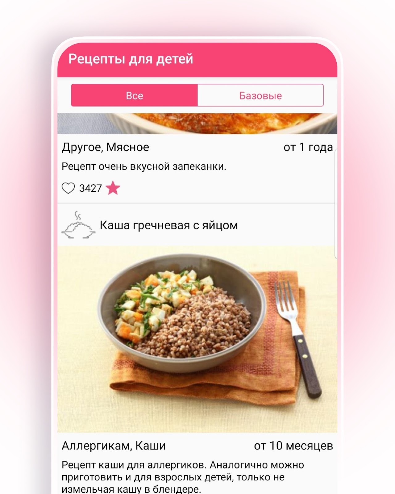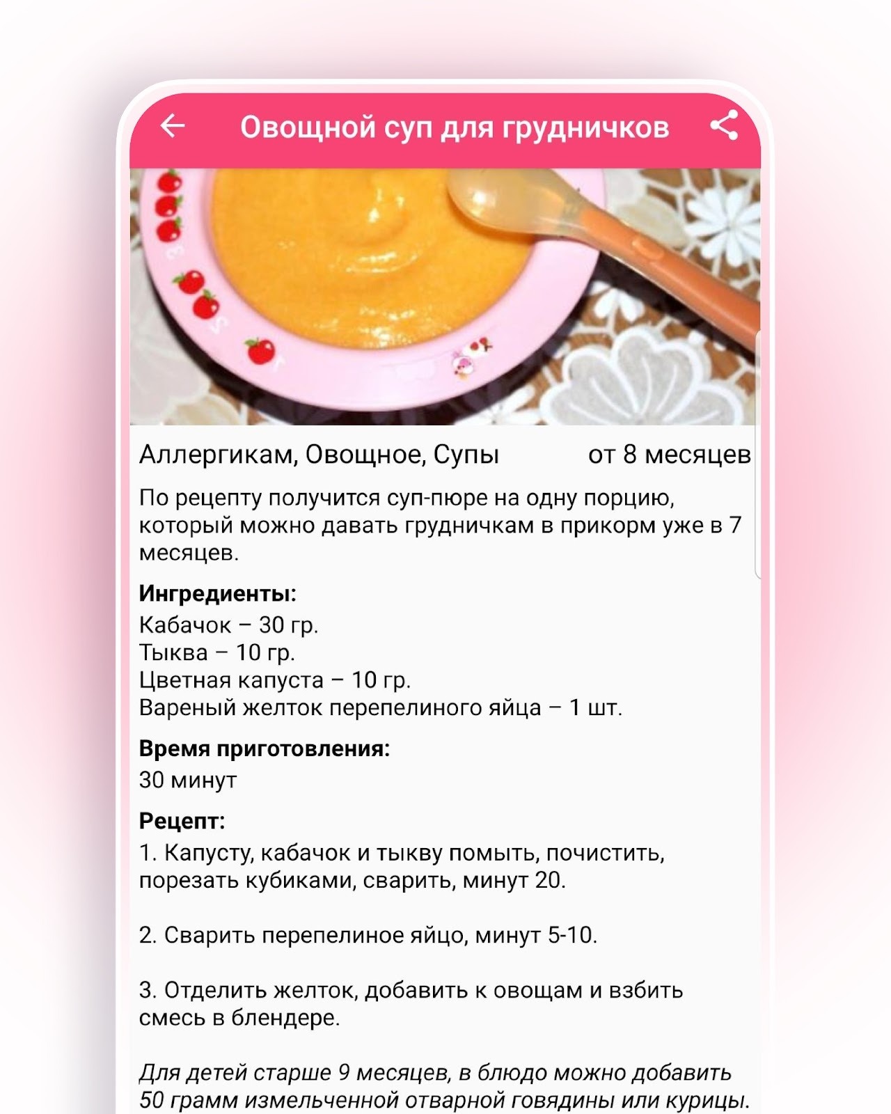 Благодаря этому кулинарному приложению вы сможете готовить интересные и вкусные блюда для своего ребенка. Можно указать возраст и выбирать среди вариантов, которые будут предложены. Укажите аллергии и продукты, которые еще не были введены в прикорм (или которые вы не даете своему ребенку по каким-либо причинам), чтобы сделать результаты точнее. Сохраняйте понравившиеся рецепты в «Избранное», чтобы радовать всю семью и своего карапуза.