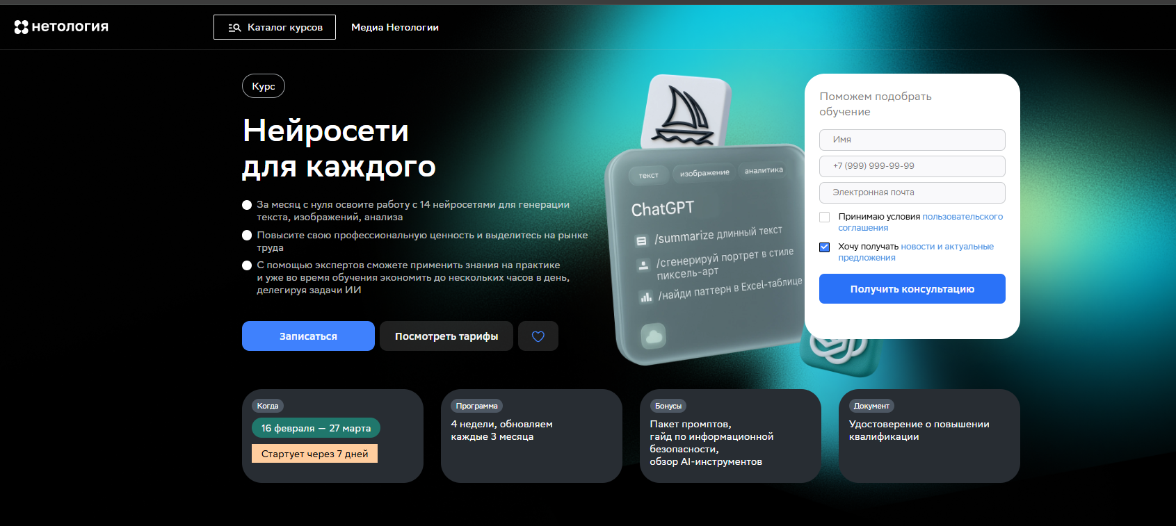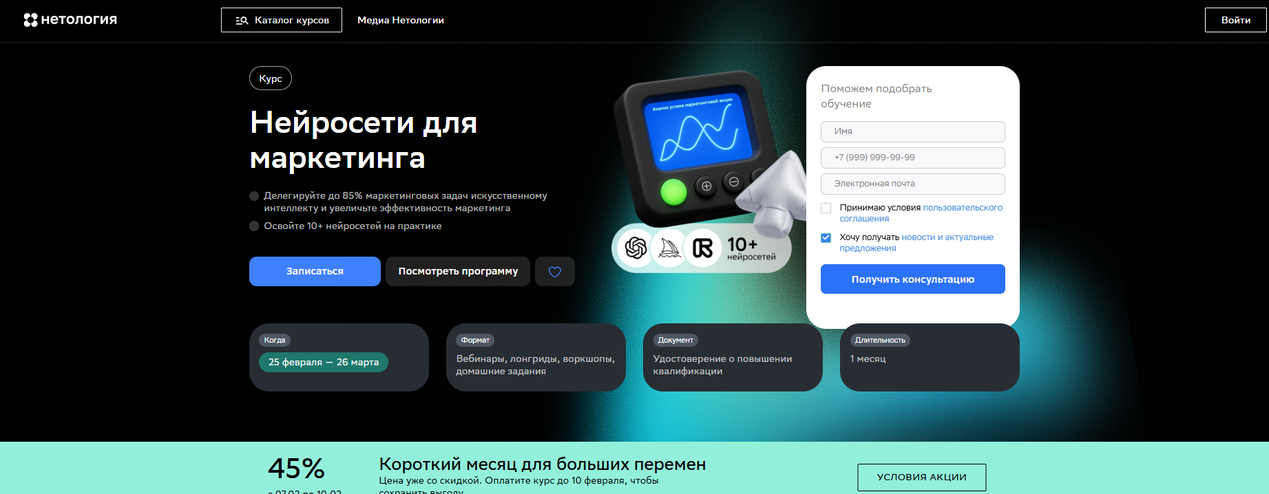 Нейросети для маркетинга — Нетология — специализированная программа для маркетологов и специалистов, которые используют ии для генерации контента и оптимизации рекламных кампаний.
