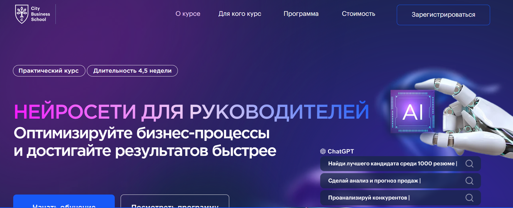 ИИ для менеджера — Moscow Business School — программа обучения длится 4,5 недели, стоимость зависит от выбранного тарифа. Курс подходит руководителям, владельцам бизнеса, менеджерам по HR, маркетологам и аналитикам.