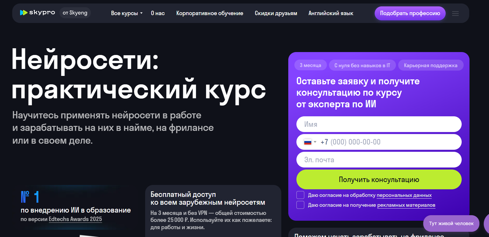 ИИ на практике — Skypro — практико-ориентированная программа для освоения применения искусственных интеллектов в рабочих процессах.