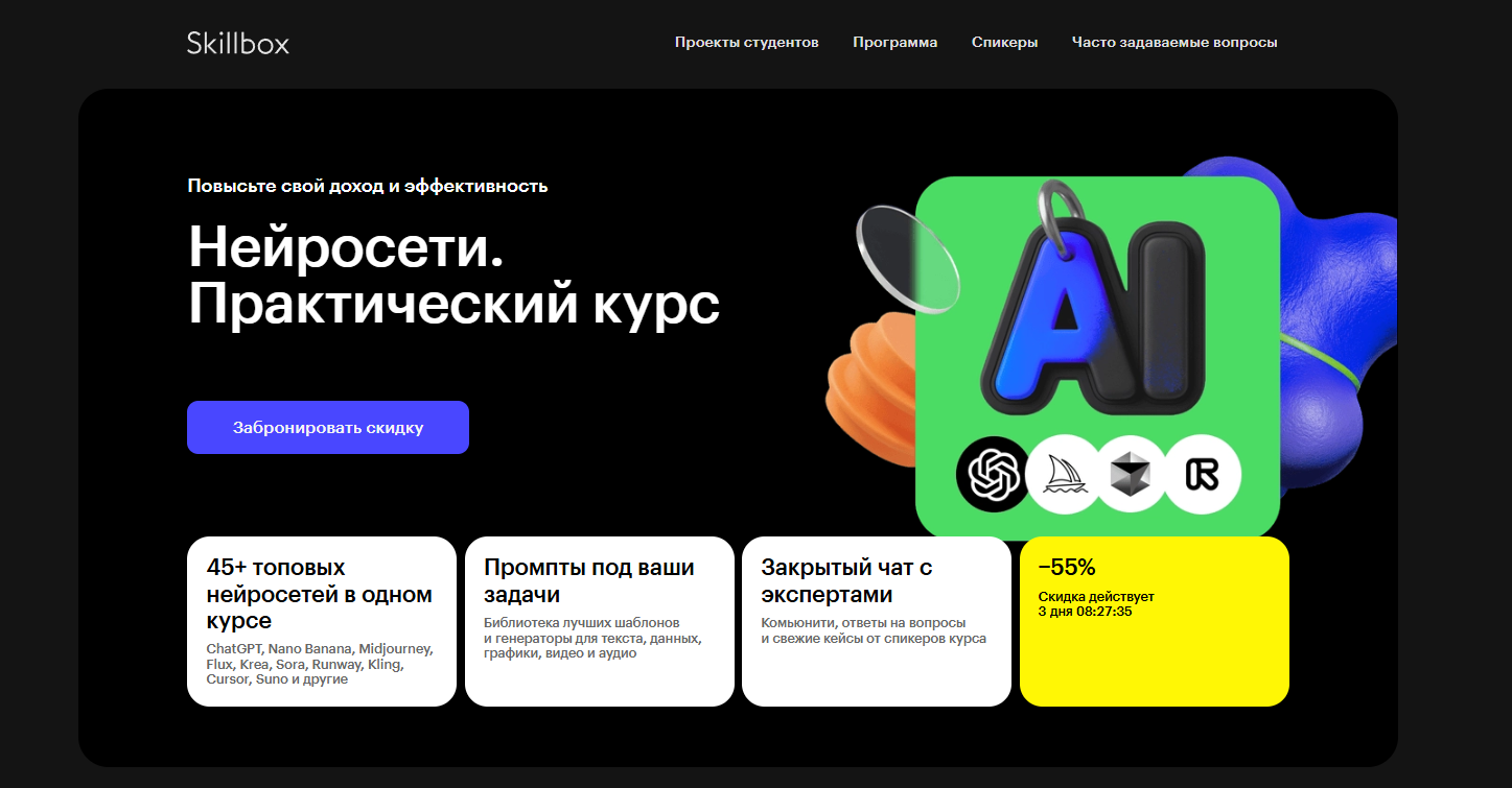 Нейросети. Практический курс — Skillbox — обучение длится 3 месяца при нагрузке около 7 часов в неделю, включает множество уроков и практических кейсов. Участники проекта осваивают работу с топовыми нейросетями, включая ChatGPT, Midjourney, Flux, Sora и Cursor. Курсы помогают научиться применять ии для создания графики, видео, аудио, программирования и анализа данных, получают библиотеку готовых промптов и доступ к закрытому чату с экспертами.