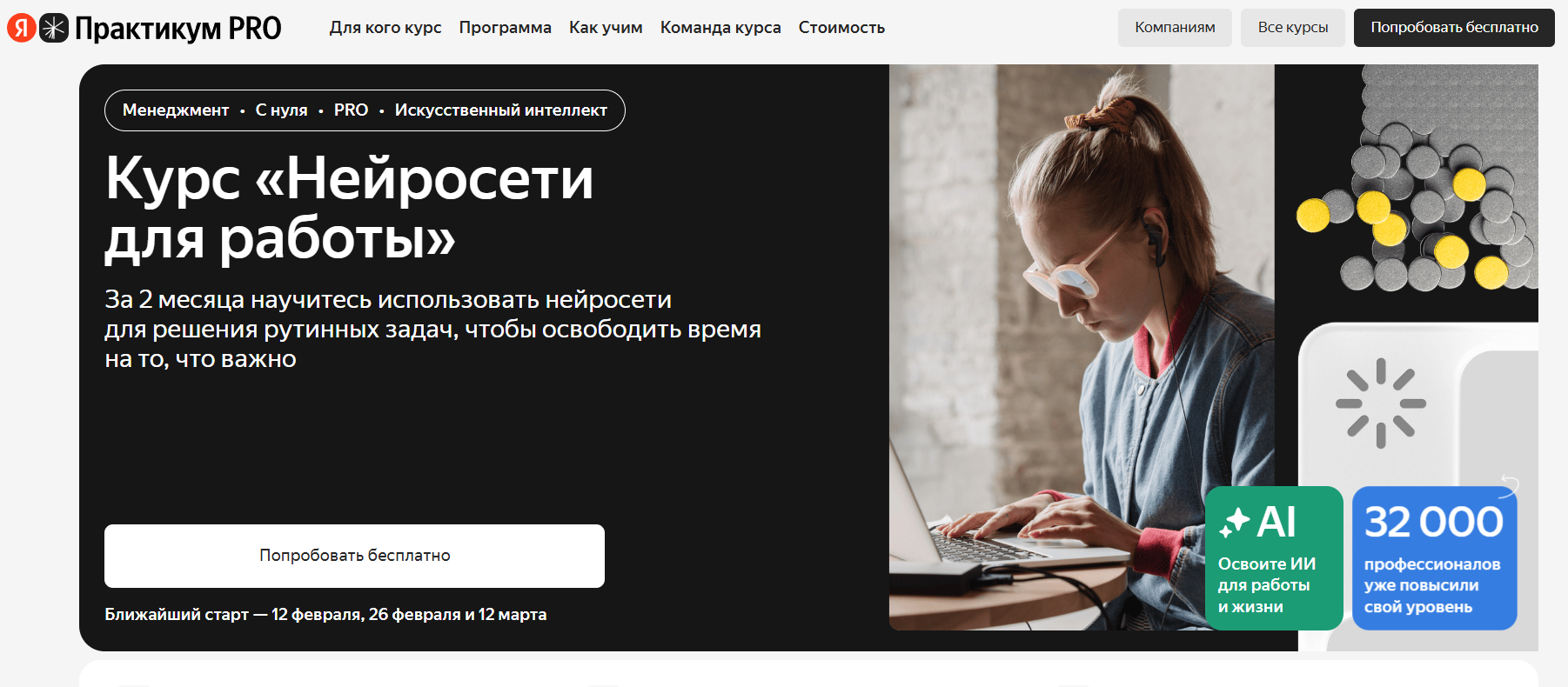 ⭐ ИИ для работы — Яндекс Практикум — обучение от Яндекса с фокусом на практическое применение нейросетей в повседневных задачах.