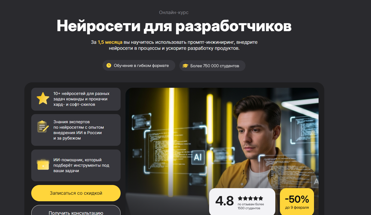 - Комплексные курсы: более глубокие программы за несколько месяцев с углубленным изучением множества нейросетей и практическими кейсами