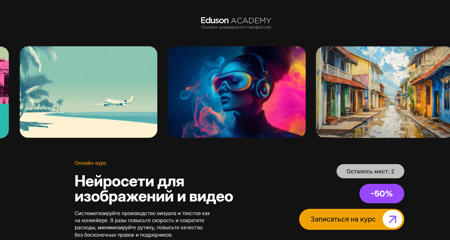 Нейросети на практике: для себя, работы и бизнеса — Eduson Academy — комплексный курс длительностью 2 месяца с изучением более 100 нейросетей, включая популярные сервисы ChatGPT, Midjourney, Claude и YandexGPT. Программа обучения строится на практических кейсах: студенты изучают применение нейросетей для маркетинга, аналитики данных, создания контента и автоматизации бизнес-процессов. Слушатели освоят навыки промпт-инжиниринга, научатся создавать тексты и изображения с помощью генеративных нейросетей, работать с таблицами Excel и Google Sheets через ии.