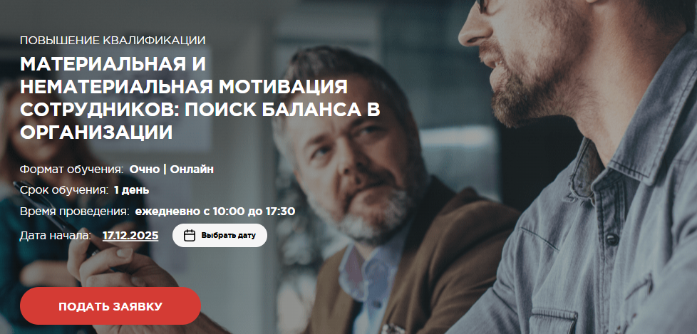 - Mосковская Бизнес Школа — Материальная и нематериальная мотивация: однодневный профильный интенсив с акцентом на поведенческую аналитику и мотивационные стратегии.