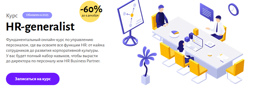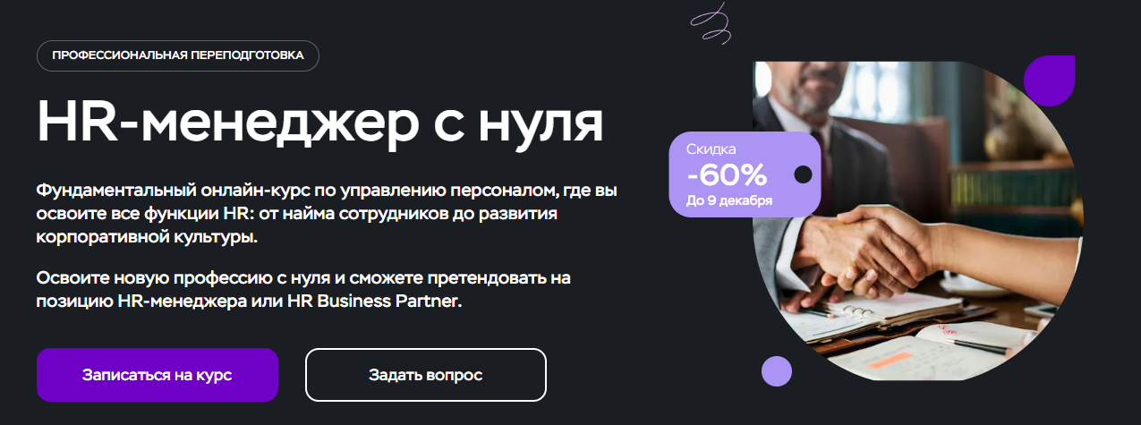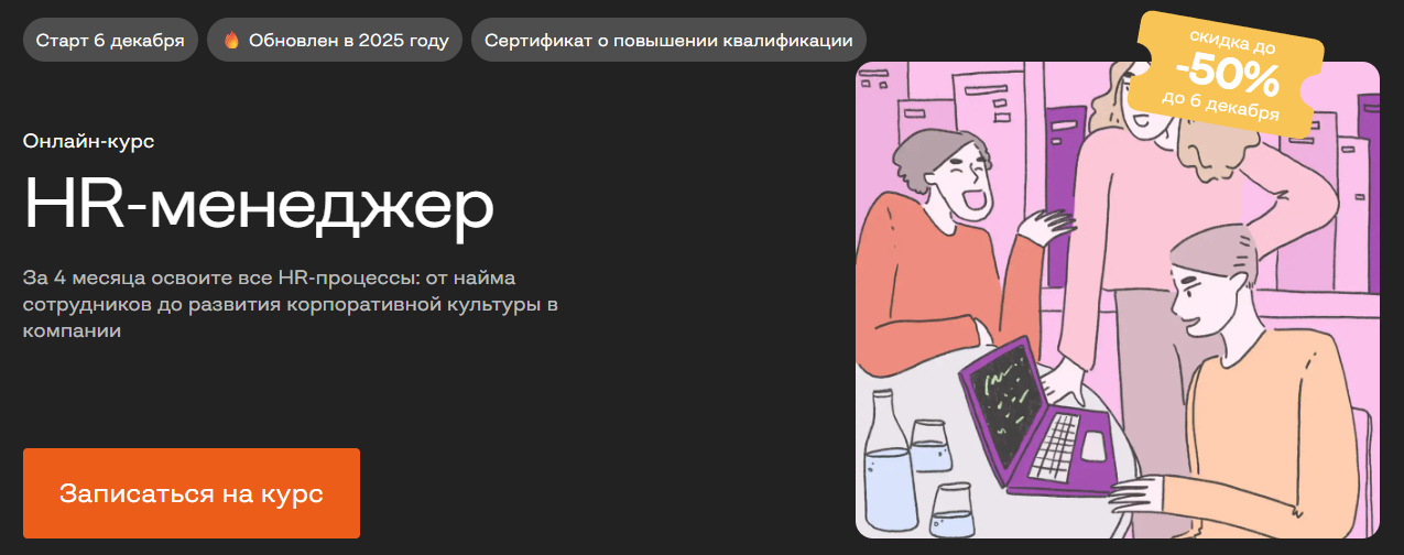 Обучение на HR-менеджера — это системная подготовка специалиста по управлению персоналом, который отвечает за подбор, адаптацию, обучение и развитие сотрудников в компании. Профессия HR-менеджера требует понимания бизнес-процессов, работы с людьми и современных инструментов HR-аналитики, поэтому обучение на HR-менеджера с нуля становится востребованным решением для тех, кто хочет войти в профессию без опыта. Курсы HR-менеджера помогают освоить кадровое делопроизводство, оценку персонала, корпоративное обучение и развитие персонала, а также навыки коммуникации и управления. Сегодня обучение на HR-менеджера доступно в онлайн-формате и подходит для смены профессии или карьерного роста. Чтобы упростить выбор, мы составили рейтинг и собрали ТОП-19 курсов менеджмента по обучению и развитию персонала, которые подходят для старта и профессионального развития в HR.