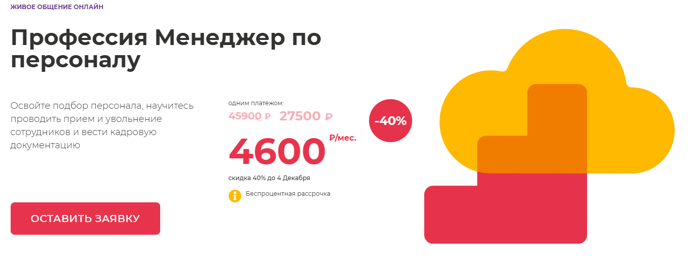 - Цена обучения: беспроцентная рассрочка на 12 месяцев от 4 841 руб/мес (с учётом скидки).