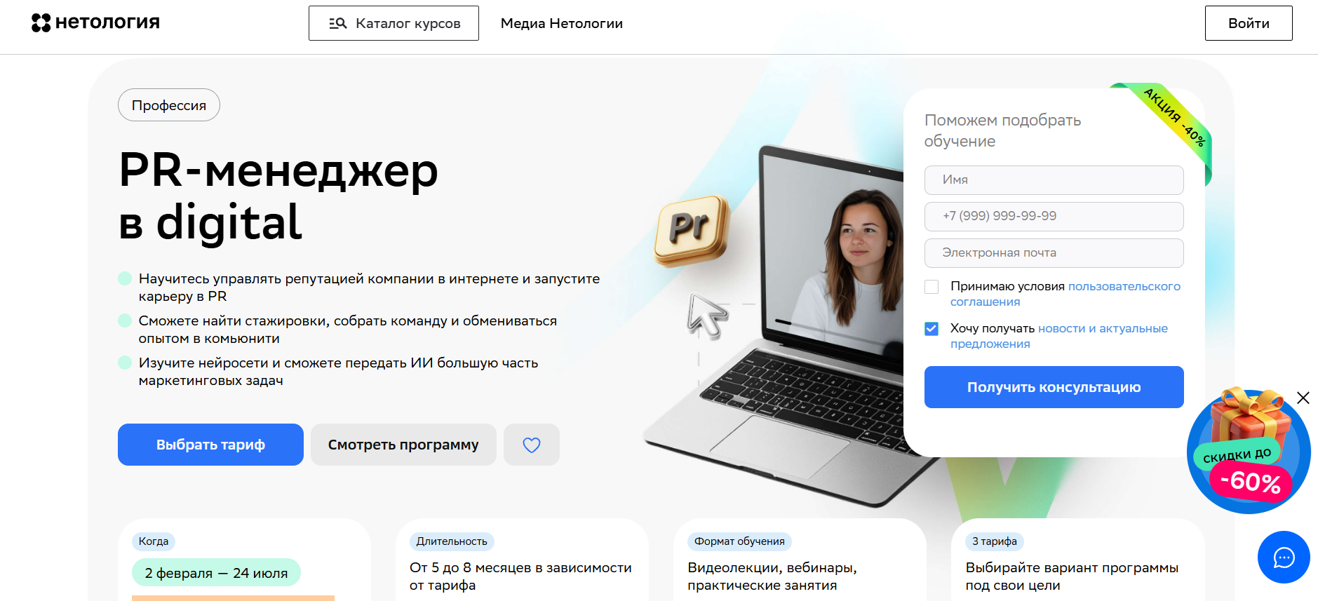 Нетология – PR в digital: Модули по нейросетям, акцент на антикризисный и цифровой PR, вечернее онлайн-обучение с поддержкой.