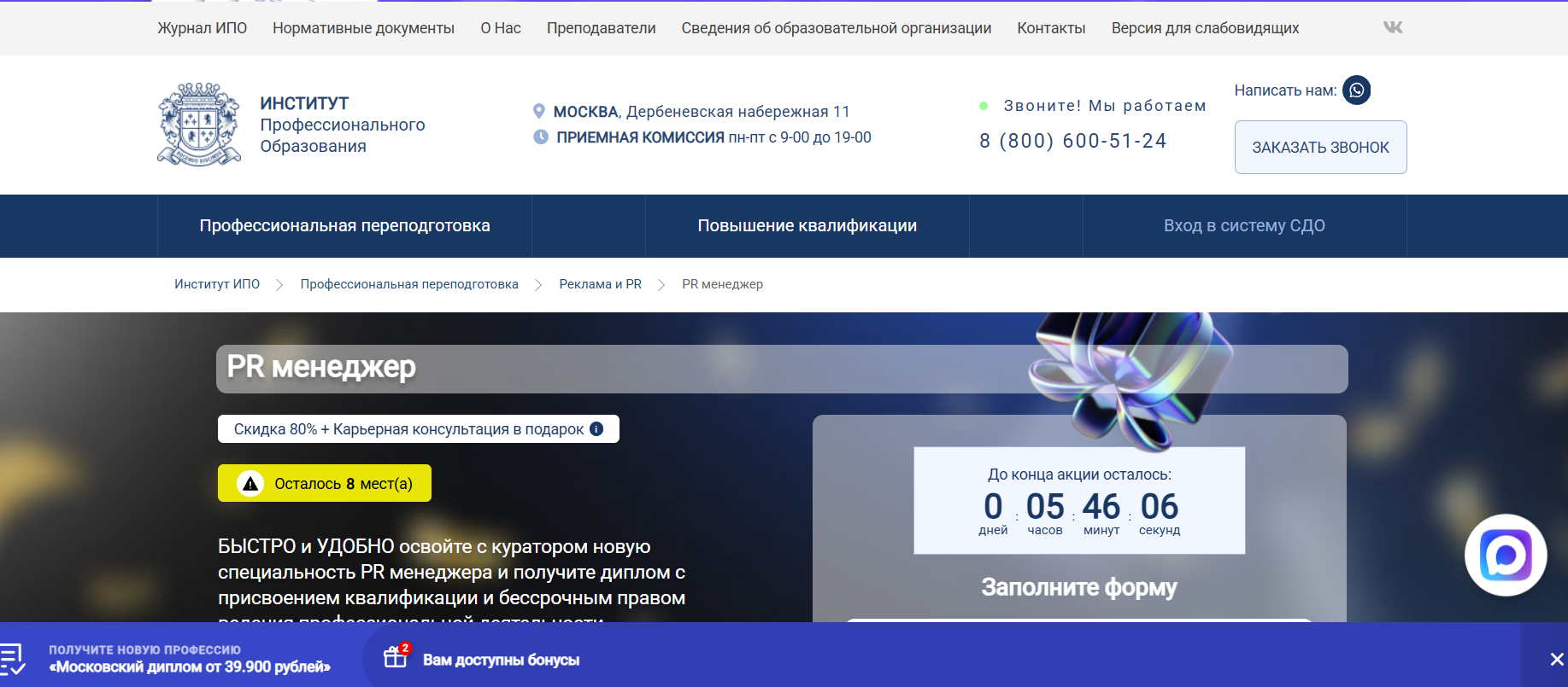 Институт Профессионального Образования: Индивидуальная карьерная консультация, бессрочный диплом, скидка до 80%, ограниченное число мест.
