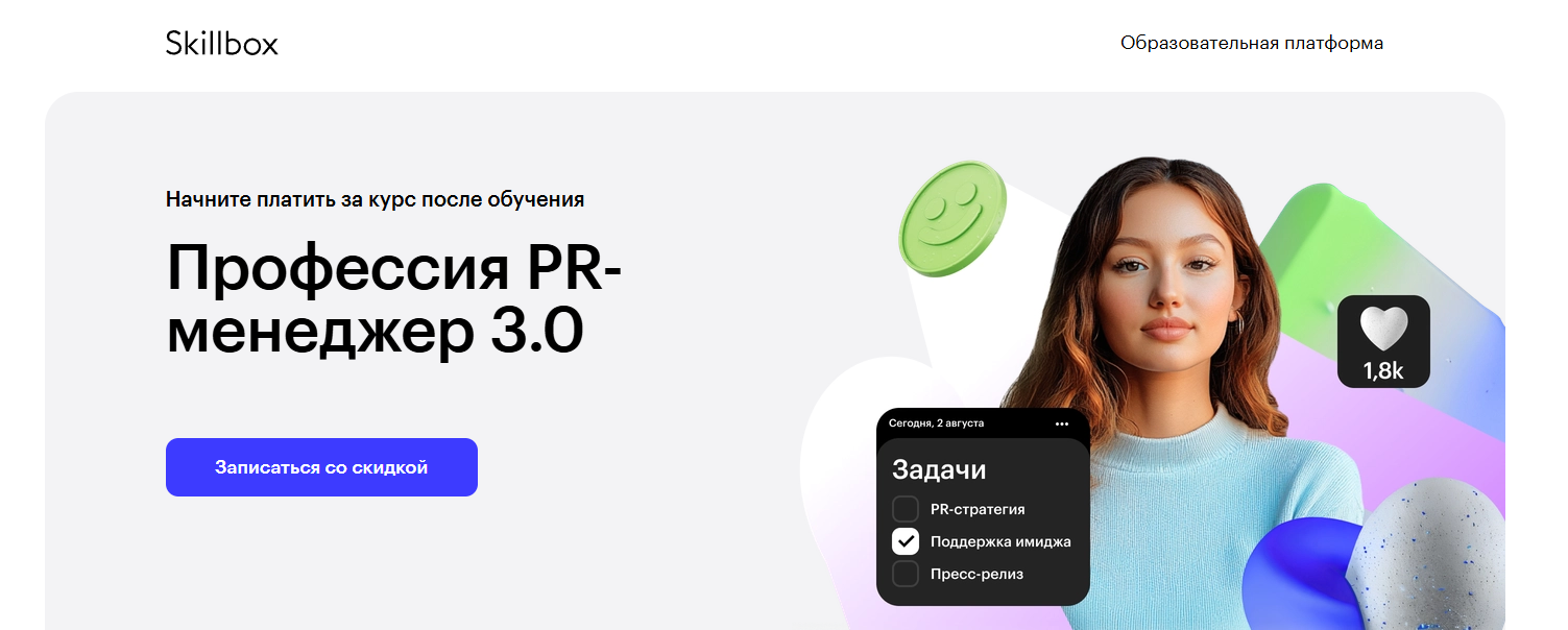 Skillbox (Скиллбокс) – PR-менеджер: Задания по реальным кейсам, поддержка HR-специалиста, курс одобрен АКОС, гибкая настройка под цели студента.
