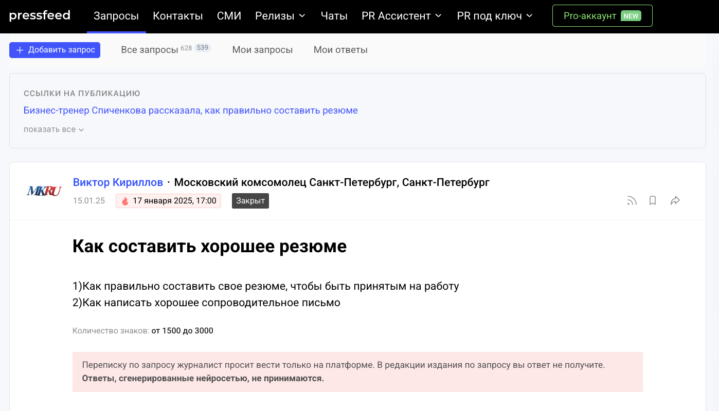 Если коротко, Pressfeed — это площадка, где журналисты публикуют запросы для своих статей, а эксперты отвечают на них. Формат простой: редакции ищут фактуру, мнения и живые комментарии, а специалисты выбирают подходящие темы и отправляют свои ответы. За счёт этого можно попасть в СМИ любого формата — от отраслевых блогов до крупных изданий вроде «Коммерсанта», РБК, «Комсомольской правды», «Известий» или региональных редакций. Оказалось, что на сервисе можно отправлять 3 бесплатных питча в месяц.