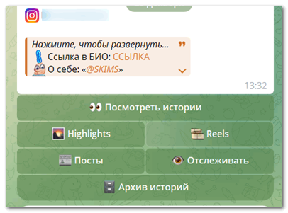 Благодаря боту вы можете просматривать последние записи, которые были добавлены в Истории и сохраненное, узнать в онлайне сейчас пользователь или нет. Также, получите полный список недавно добавленных публикаций.