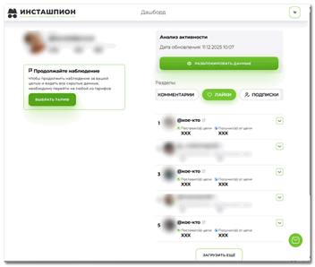 Сервис уникален среди подобных сервисов в том, что не требует подключения к вашему аккаунта и отображает перекрестную активность. То есть, все лайки и комментарии, которые были отправлены и получены. Таким образом вы можете легко изучать до 3 аккаунтов, и при необходимости переключаться на другие, изучив детально: