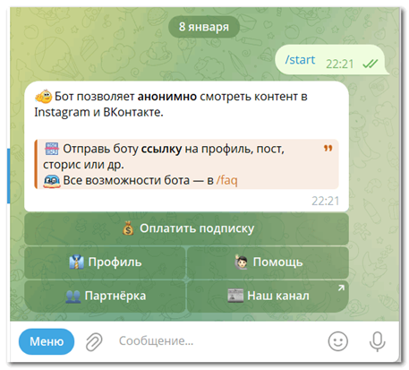 Это специализированный Telegram-бот, предназначенный для анонимного просмотра и анализа контента в Инстаграм*, включая посты, сторис, рилсы и хайлайты.