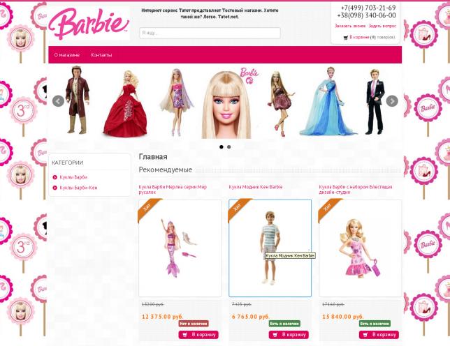 На картинке вы видите пример тестового интернет-магазина my-barbie.tatet.ru. Обратите внимание на то, как удачно подобрано цветовое решение – на розовом фоне куклы Барби смотрятся органично и только выигрывают за счет грамотного цветового оформления. Розовый - цвет нежности и невинности, символизирующий цветущую юность молодых поклонниц Барби. Не зря этот цвет был выбран для бренда кукол. Да и представить себе детскую куклу на фоне, например, цвета защитной формы - хаки – достаточно трудно. Такое оформление, скорее всего, отпугнуло бы потенциальных покупателей.
