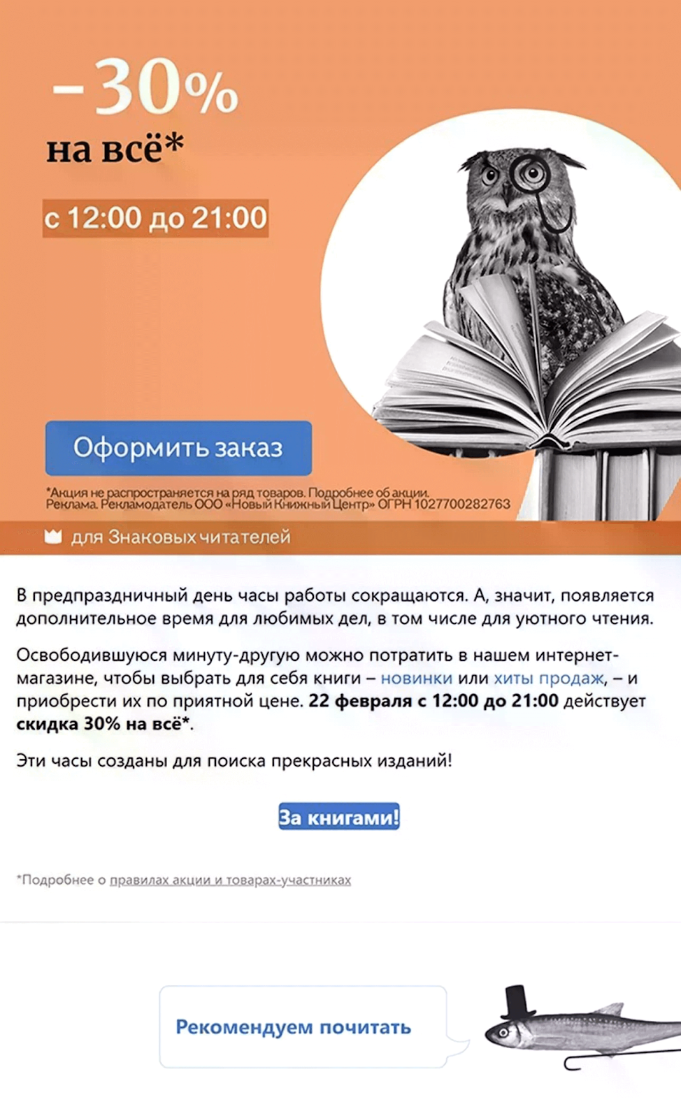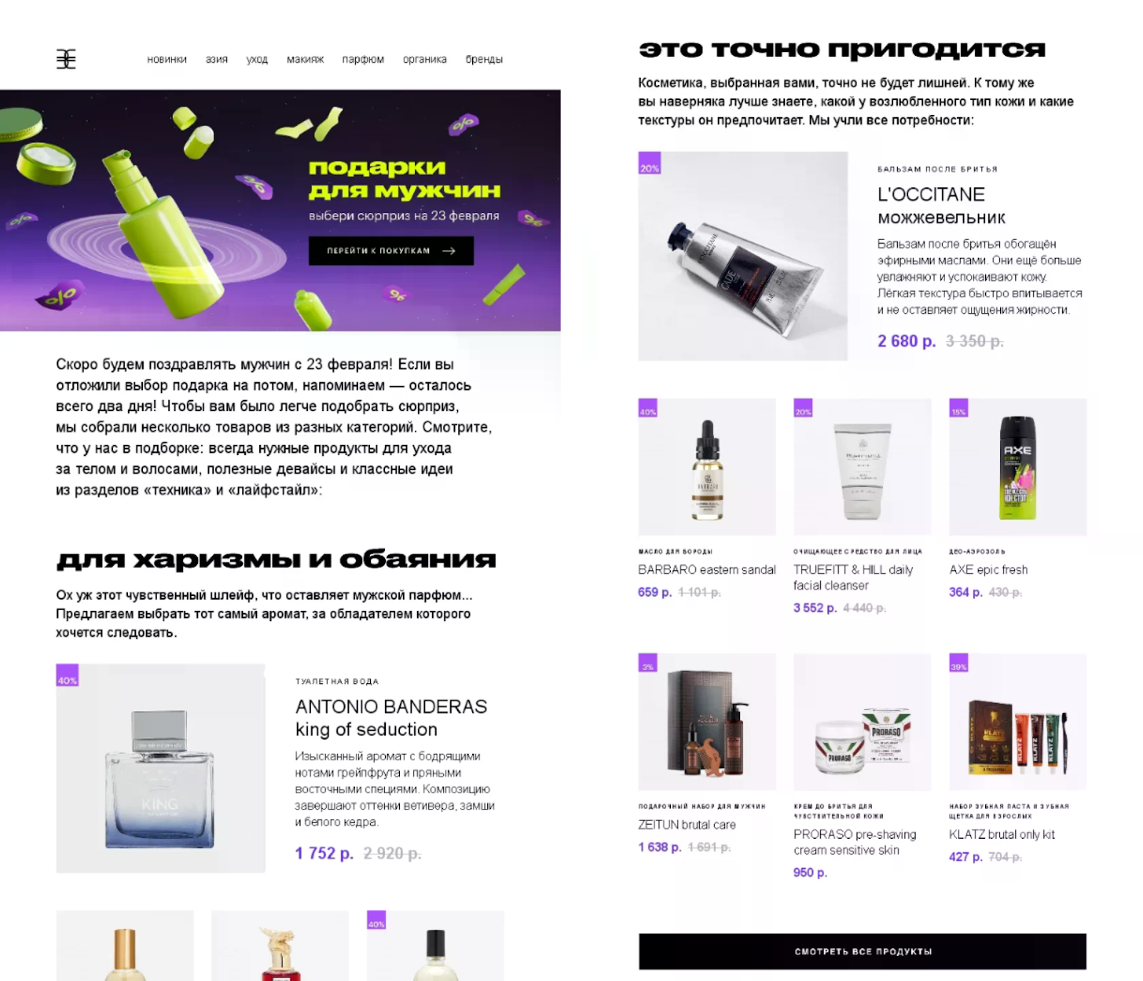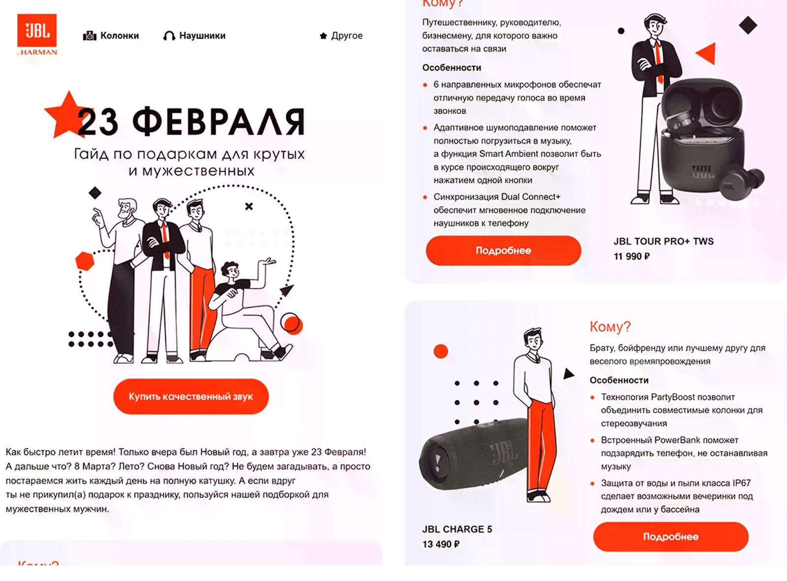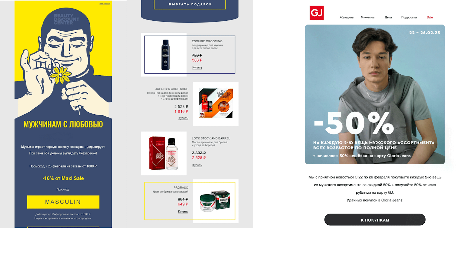 Типичная рассылка к 23 февраля предсказуема уже в теме письма. Пользователь открывает почту — и видит десяток похожих заголовков, отличающихся только процентом скидки.