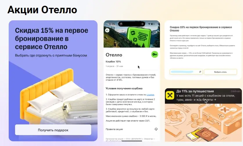 Персональные промо‑блоки, push‑уведомления, внутренняя баннерная реклама, дополнительная скидка 15% на первое бронирование, кэшбэк 10% и другие сезонные офферы рекламодателя сконвертировались в прирост общего оборота на 22% за период работы.