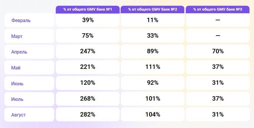 В силу того, что пользователи банковских приложений статистически конвертируют в покупки чаще, подключение к банковским приложениям через Адмитад Лояльность дало высокий ROI, а GMV в каналах инструмента за 7 месяцев вырос на 69%. Более того, клиент получил прозрачную и контролируемую статистику благодаря надежности транзакционного трекинга.