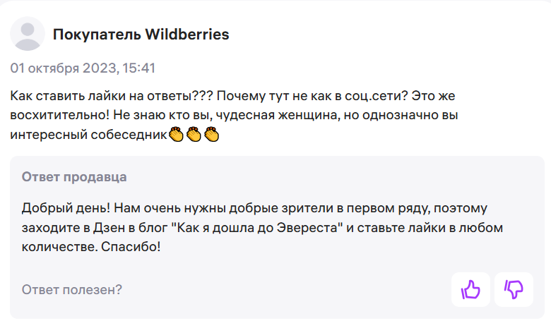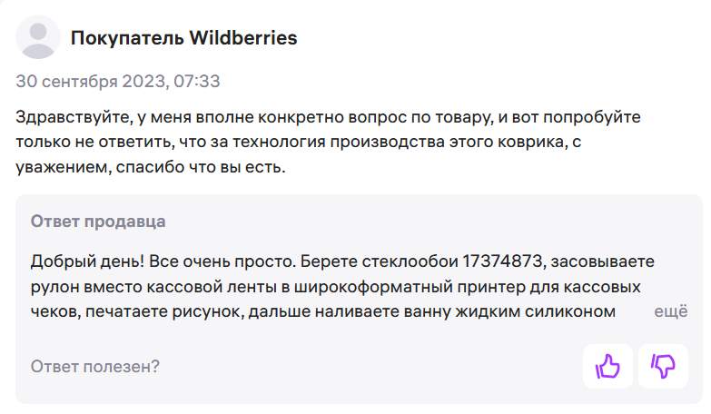 В 2023 году завирусились карточки ковриков для теста на Wildberries. Продавец настолько старательно и избыточно отвечал на каждый вопрос клиентов, что его начали спрашивать обо всём. И это только добавило коммуникации обаяния.