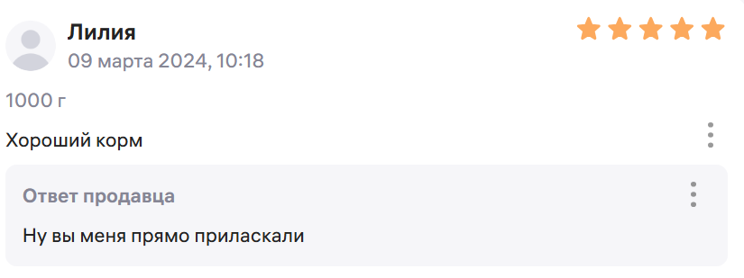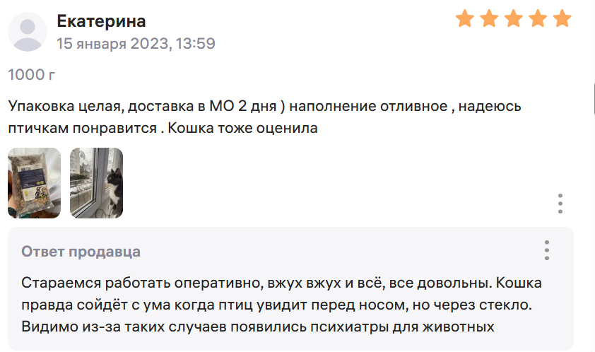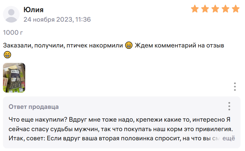 В 2023 году в сети завирусились ответы продавца корма для уличных птиц на Wildberries. В отличие от классического “спасибо за обратную связь”, представитель каждый ответ превращал в смешной стендап. Тонкое чувство юмора и чуткость были тепло приняты и оценены лайками и репостами. А пользователи начали массово скупать корм… ради смешного ответа. Результат — почти 17 тысяч отзывов на корм для птичек и 100 тысяч проданных товаров.
