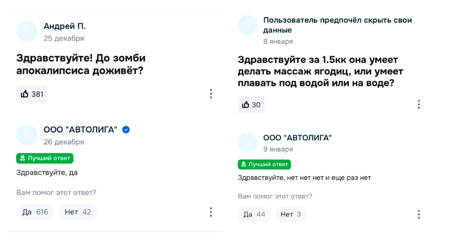 В декабре 2025 года на Ozon появилась в продаже культовая “буханка” УАЗ 390995 за 1,5 млн рублей. Пользователей цена несколько удивила, и они начали интересоваться, на что машина способна за такую сумму. Но завирусилось даже не это, а то, с каким вселенским спокойствием отвечал на каждый странный вопрос представитель продавца. В итоге более 630 вопросов на одну карточку и бесплатная реклама дилера в мессенджерах.