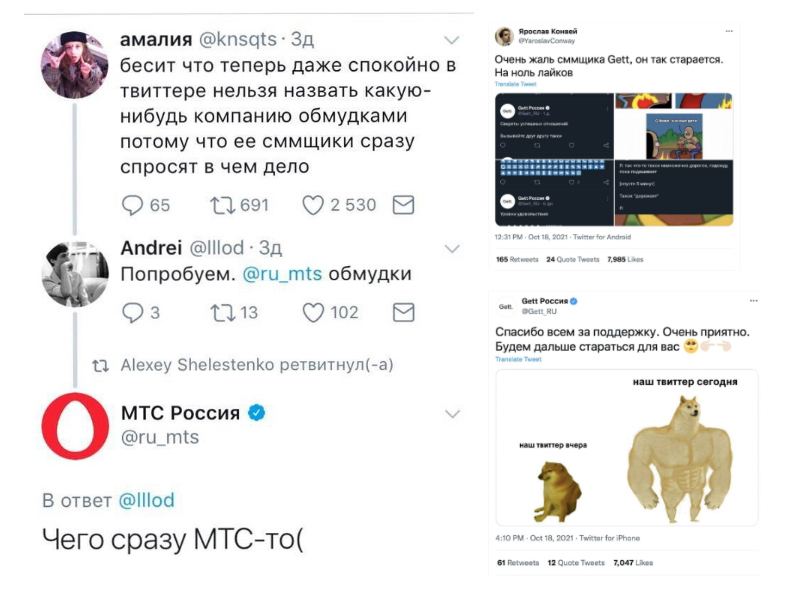 Ещё один пример — аккаунт Gett, который почти не собирал реакций в Твиттере. Это заметил один из пользователей, в результате компании накидали лайков, и Gett ответил милой самоиронией.