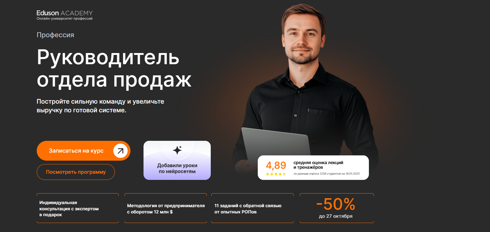 Руководитель отдела продаж от Eduson Academy — готовая система управления продажами с 177 уроками и 31 бизнес-кейсом от предпринимателя с оборотом 12 млн долларов.