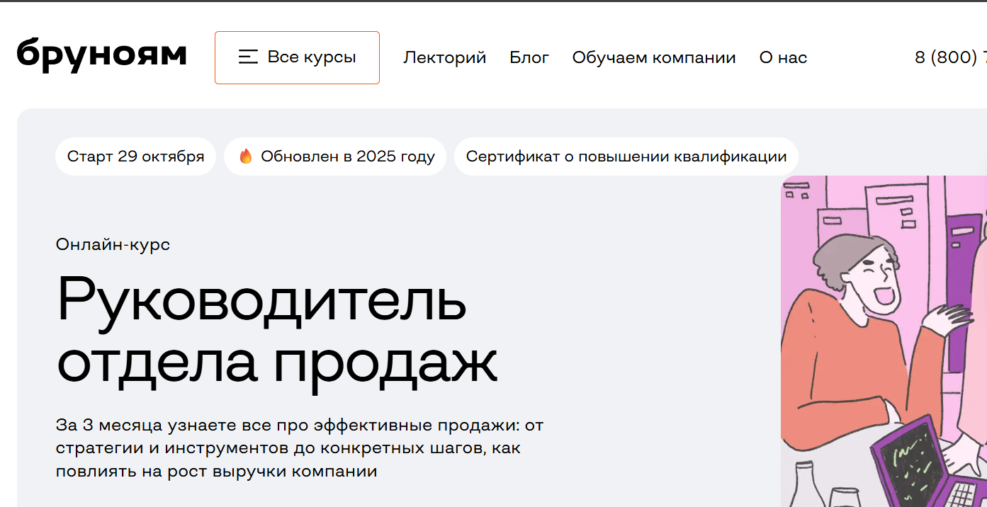 Руководитель отдела продаж от Бруноям — обучение за 3 месяца на живых онлайн-встречах с практикой и разборами вопросов от личного наставника команды.