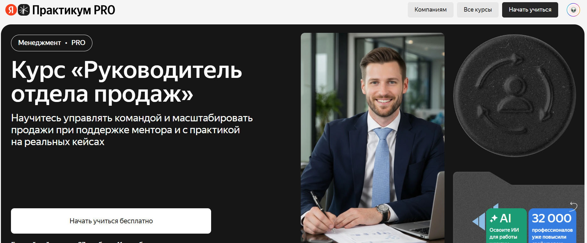 Руководитель отдела продаж от Яндекс Практикум — курс повышения квалификации с 5 воркшопами с наставником и 4 индивидуальными онлайн-встречами с ментором.