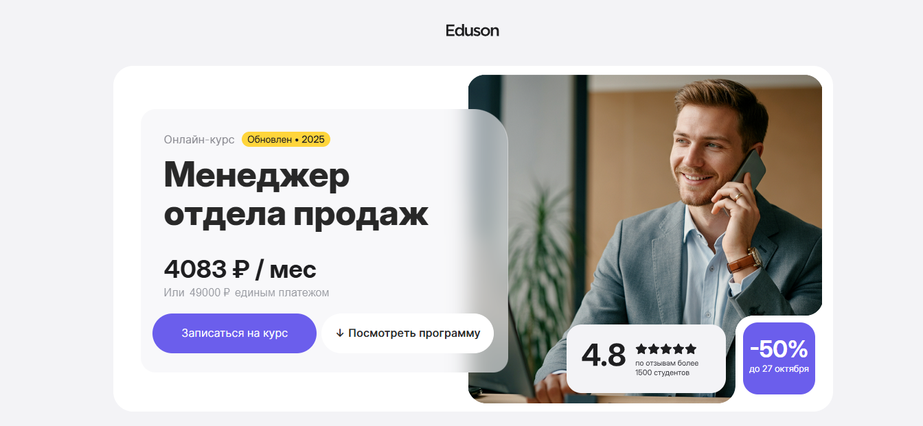 Менеджер отдела продаж от Eduson Academy — практическая программа обучения с 105 интерактивными уроками и симуляторами реальной работы отдела продаж для начинающих специалистов.