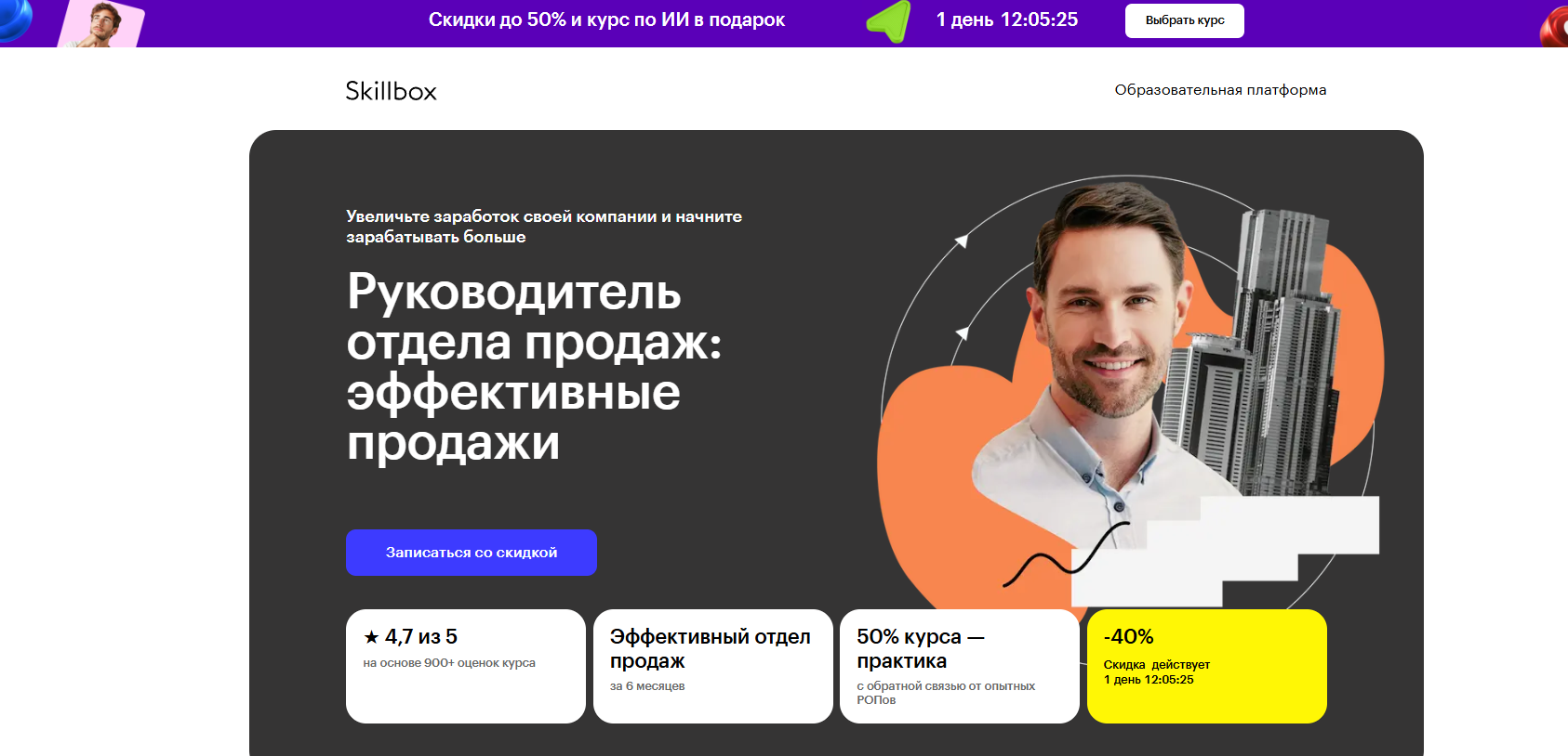 Руководитель отдела продаж от Skillbox — эффективные продажи в B2B и B2C сегментах с обучением у Вадима Дозорцева и 23 проектами для практики.