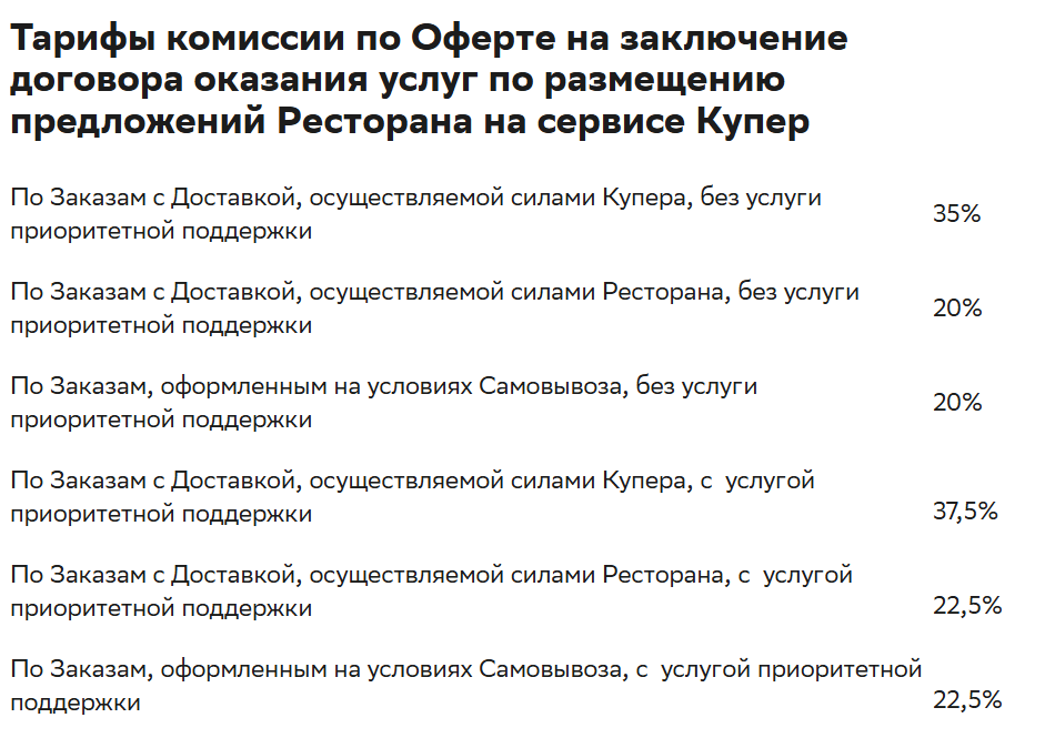 Как и остальные агрегаторы, Купер работает по системе с комиссиями. Размер варьируется от 20 до 37,5% и зависит от способа доставки (свои курьеры или Купера, а также самовывоз) и наличия приоритетной поддержки. Приоритетная поддержка чем-то похожа на подписку у Яндекса или тарифы Uber. За +2,5% к комиссии вам выделят персонального менеджера, ускорят разные процессы, вроде получения документации, помогут проанализировать финансы и будут более развёрнуто отвечать на вопросы.