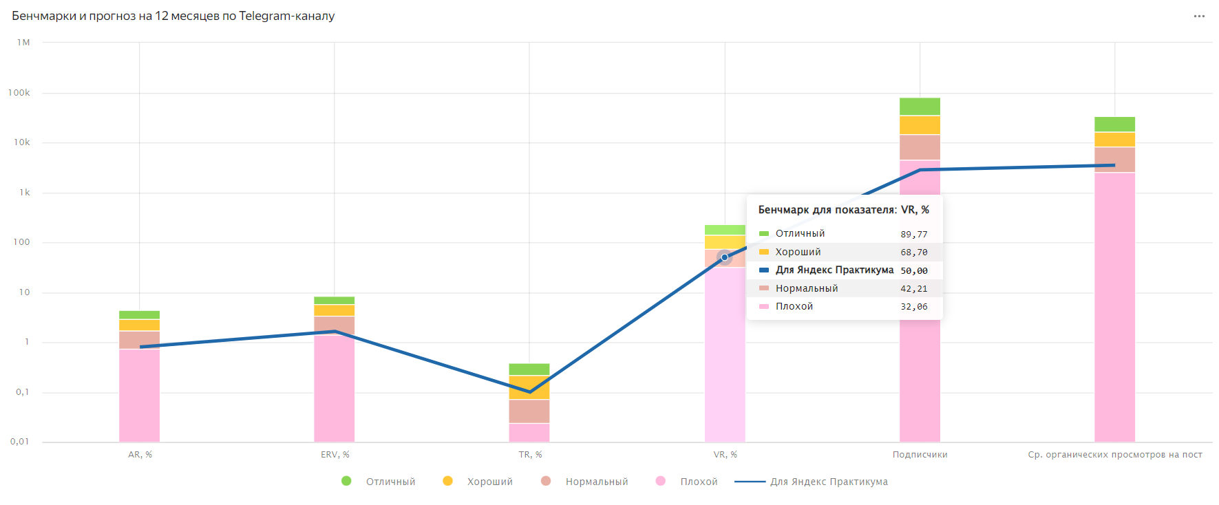 Визуализация бенчмарков и показателей проекта. Хороший вариант делать это на комбинированной диаграмме в Yandex Data Lens. Нужно задать через столбцы диапазоны уровней, а линией отразить текущие значения нашего аккаунта по каждому показателю. Также можно собрать уровни для всех показателей в Google Таблицах.