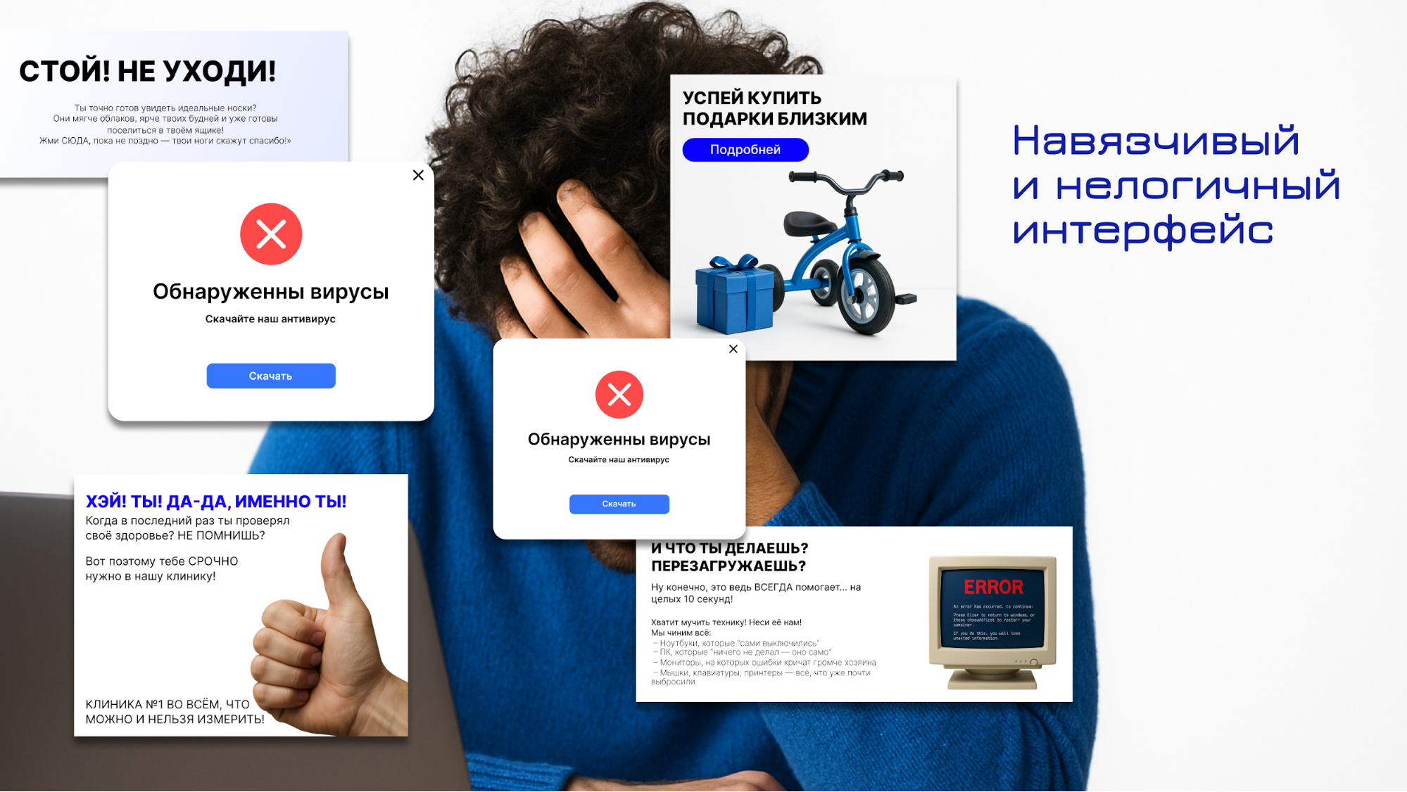 Нагромождение нелогичных уведомлений и навязчивых кнопок сбивает с целевого действия
