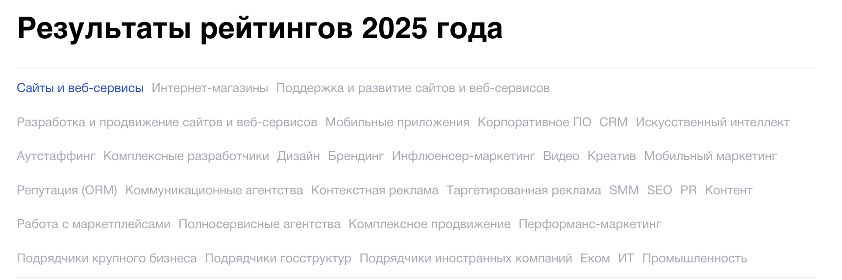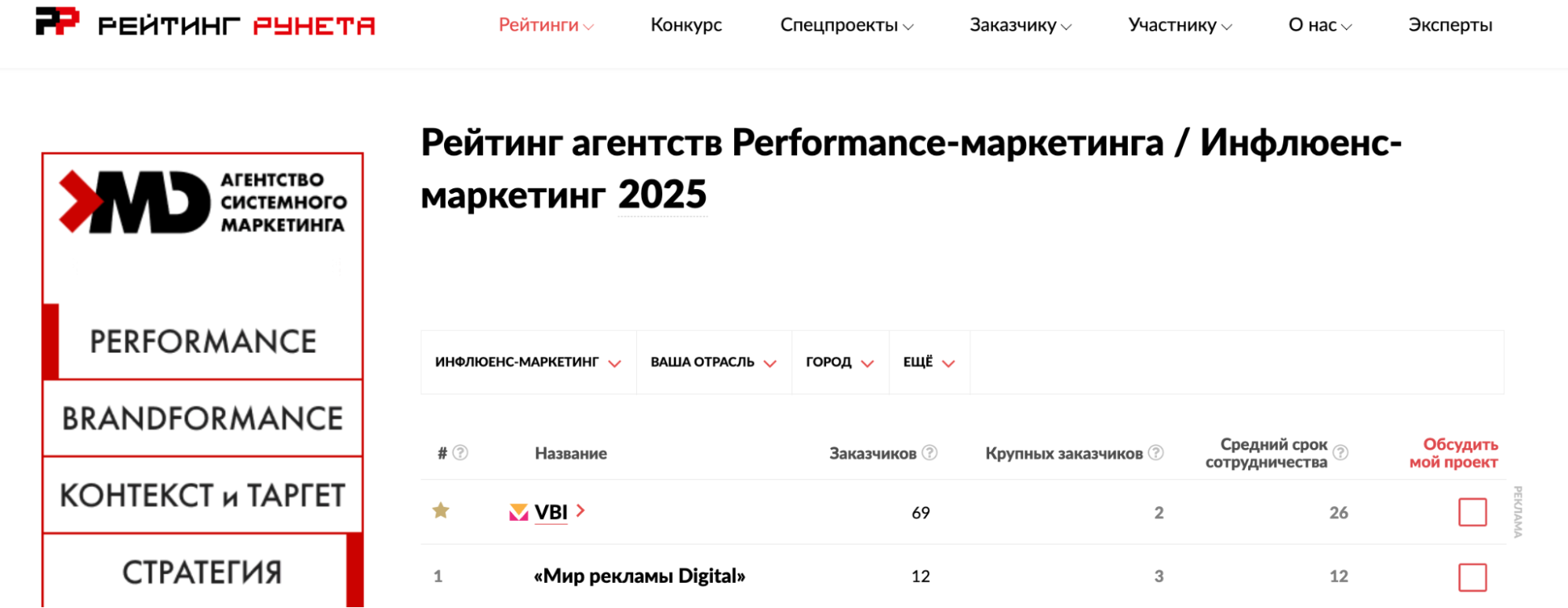 6. Срезы под ваши компетенции. Чем точнее срез (например, SMM, перформанс, инфлюенс), тем выше шанс попасть в релевантный короткий список у клиента. «Рейтинг Рунета», в частности, богат на такие категории.