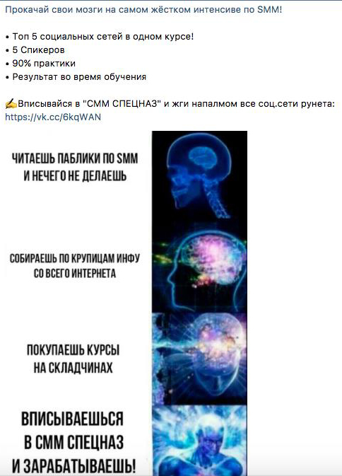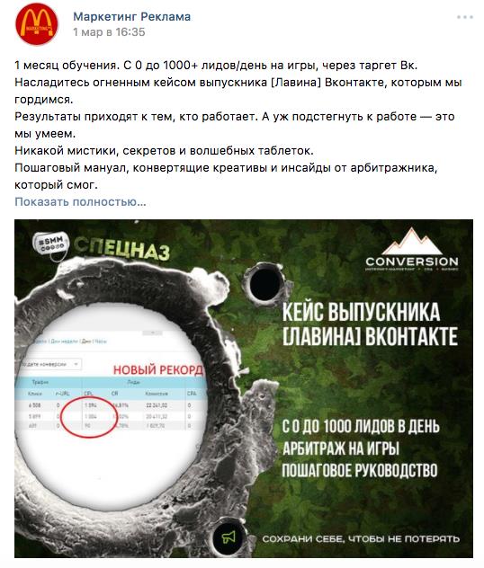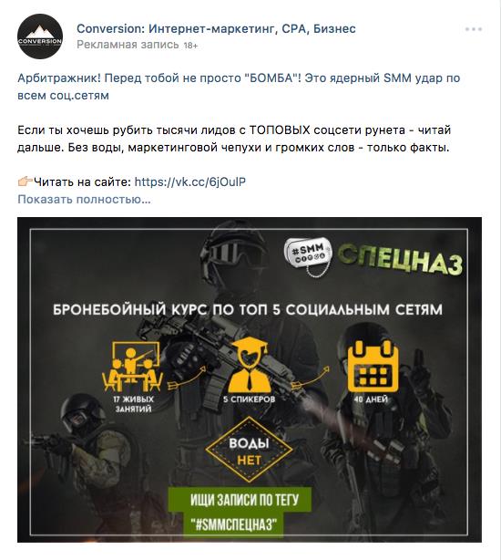Обучающий. Бо́льшая часть постов была обучающей. Особенно хорошо показал себя кейс одного из учеников, который вышел на 1000 конверсий в день в игровой тематике (стоимость одной конверсии — 15–30 рублей) ещё во время первого пробного курса (урезанная версия #smmспецназ, посвящённая только работе с «ВКонтакте»). В кейсе ученик рассказал о том, как выбирал офер (программу, с которой он будет работать), как создавал рекламные объявления и проводил тестирование, то есть прошёл по всем этапам запуска рекламной кампании.
