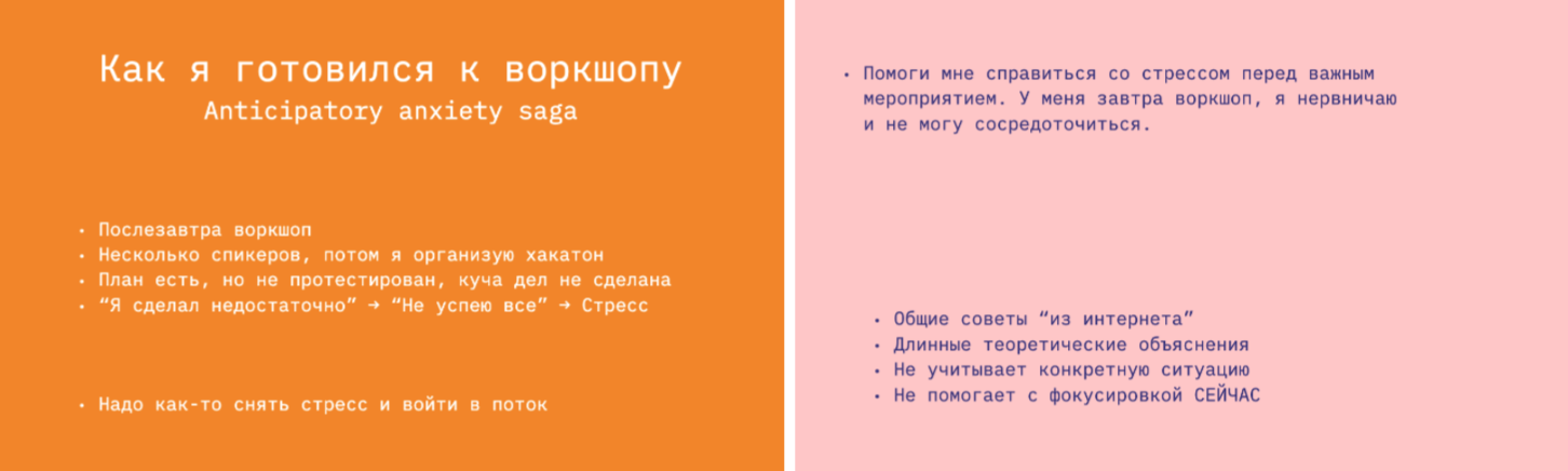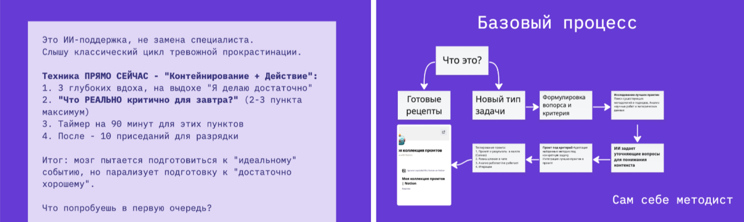 В качестве примера — личная «сага» подготовки к воркшопу, где Алексей показал, как использовать ИИ, чтобы справиться с тревожной прокрастинацией.