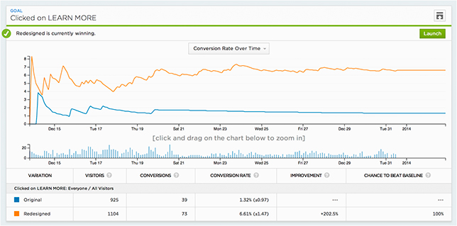 Мы сделали обе кнопки, призывающие к действию заметными, но достаточно разными, чтобы убедиться, что они не будут конкурировать за внимание людей. Кнопка «Подробнее» (Learn more) была предназначена для того, чтоб удержать сомневающихся посетителей, но при этом не отвлекать тех, кто уже готов попробовать. Такое простое действие, но улучшение было огромным — более чем на 200%!