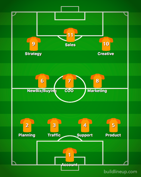 Каждый из игроков на поле выполняет конкретную функцию, которая позволяет команде решить две главные задачи — забить гол или не пропустить гол. Задача обороны — удержать ворота (читай, бюджет клиента) в неприкосновенности, задача атаки — получить новый бюджет, задача полузащиты — эффективно помогать, сохраняя баланс между обороной и нападением.