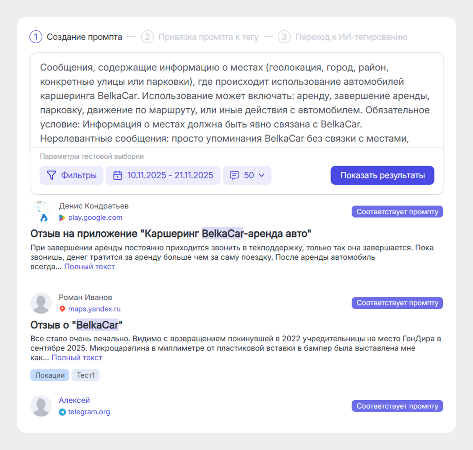 В результате ИИ-тегирования сообщениям, которые соответствуют промпту, будет проставлен выбранный тег (Теги – это произвольные текстовые метки, которые можно добавить к сообщениям). Одновременно для ИИ-тегирования можно запустить разметку 5 тегами.ИИ-анализ комментариев