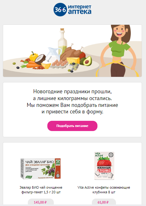 Реализация в email-рассылках: предложите детокс-программы, подборку спортивного питания, легкие продукты; оформите гайд с рекомендациями по разгрузке или правильному питанию.