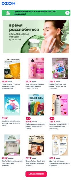 Реализация в email-рассылках: предложите подборки товаров для принятия ванны — масла, соли, свечи, полотенца; подборку книг, аудиокниг, расскажите об услугах СПА, косметолога, сделайте подборку музыки для отдыха и медитации.