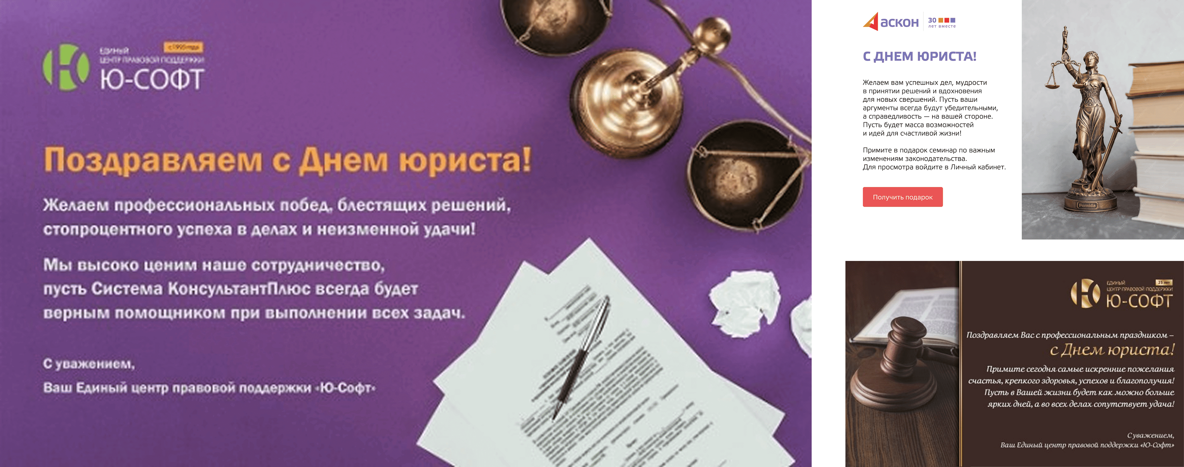 • Реализация в email-рассылках: поздравьте коллег и клиентов, предложите юридические консультации, специальные акции на услуги.