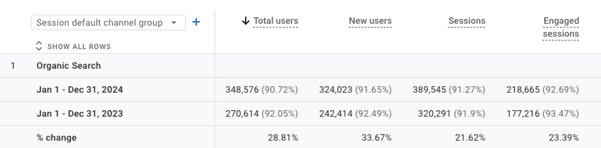 Улучшенная стратегия привела к росту как количественных, так и качественных метрик. По сравнению с 2023 годом число пользователей увеличилось на 7,5%, количество сессий — на 3,6%, а вовлечённость — на 5,7%.