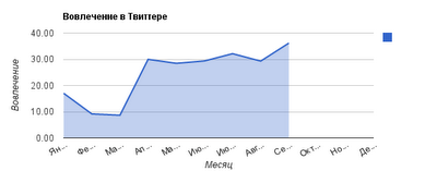 Способов подсчета вовлечения и формул множество, мы же делаем так. По каждой сети (Facebook и Twiiter) подсчитываем нашу активность (количество постов, твитов), ответную активность пользователей (ретвиты, добавления в избранное, лайки, клики и т. д.) и делим второе на первое. В результате получаем условный показатель "Вовлечение", который демонстрирует, сколько в среднем реакций вызывает одно наше действие, и соответственно, можем оценить степень интереса к нашему контенту, отслеживать ее в динамике и т.д. Мы считаем вовлечение отдельно для Facebook страницы и нашего Twitter аккаунта, потому что типы публикуемого там контента у нас разные, разные и реакции пользователей, и смешивать метрики вовлечения на этих платформах в одну было бы не правильно.
