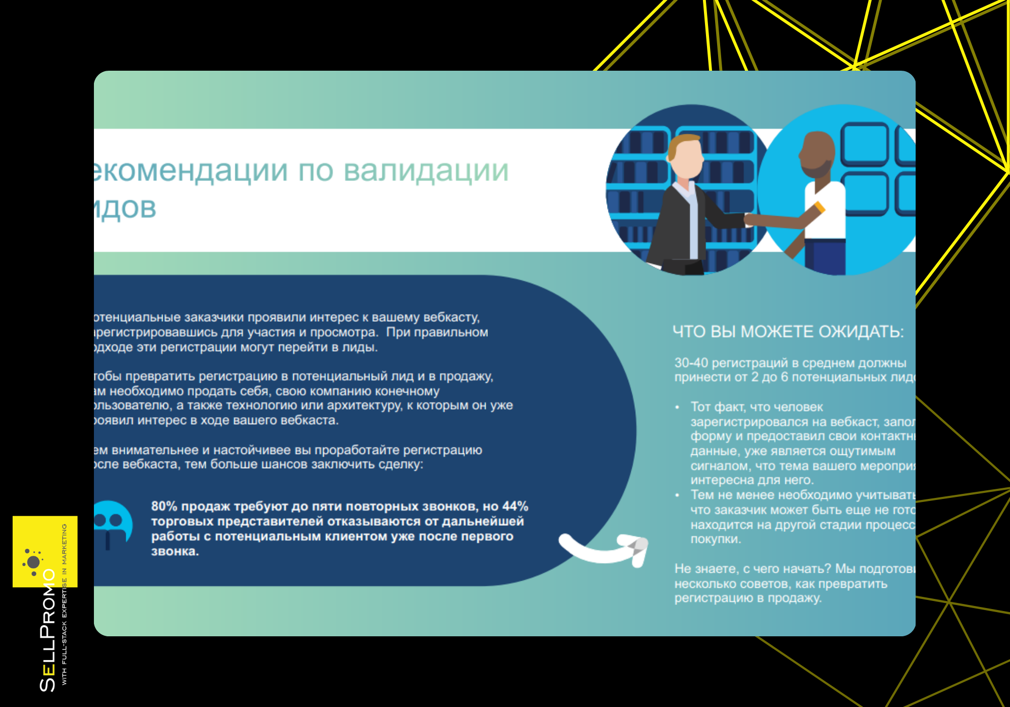 Для первичной квалификации лидов применялся простой скоринг: сочетание «компания — должность — тема вебкаста — % просмотра вебкаста — просмотры других вебинаров». По результатам скоринга контакты либо признавались нецелевыми, либо оставались на дальнейший «прогрев», либо сразу передавались сейлам партнёра для оценки по BANTу и последующей проработки. Это защищало сейлов партнёров от потока «сырых» контактов и повышало доверие к централизованной программе.