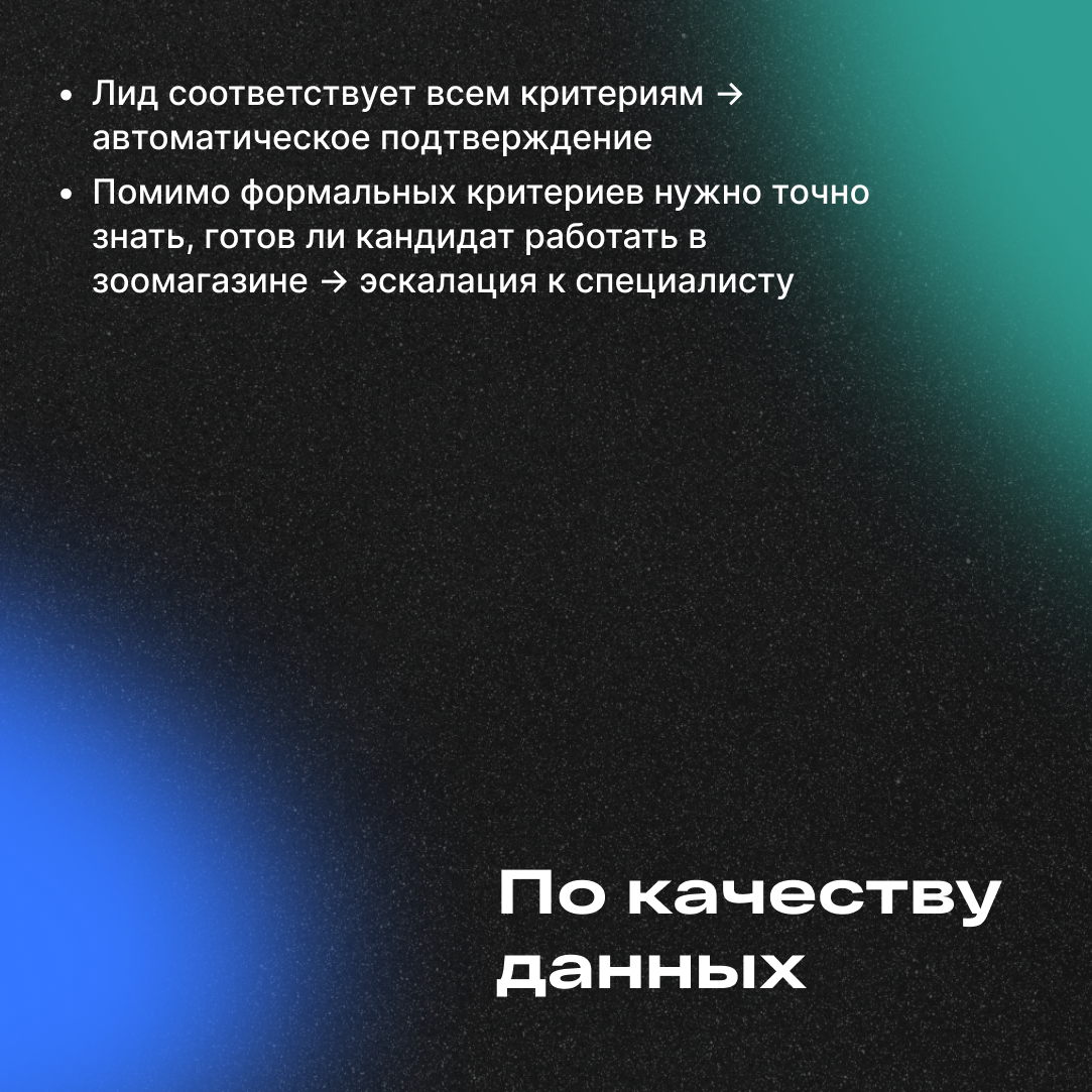 - 20% лидов (нестандартные ситуации, спорные кандидаты) эскалируются к рекрутерам — им нужно задать дополнительные вопросы